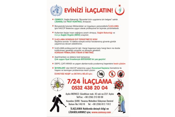 İLAÇLAMA HİZMETLERİ CEMSOY; Türkiye Halk Sağlığı Kurumundan yetkilendirilmiş “Biyosidal Ürün Uygulama İzni” belgeli LİSANSLI bir PEST KONTROL firmasıdır. Günümüzde İlaçlama sektöründe bir çok firma mevcuttur, ancak kurumsal olarak çalışan lisanslı firmaları tercih etmeniz, aldığınız hizmetin karşılığını görmeniz açısından önemlidir. CEMSOY; Bünyesinde bulunan Mühendisler ve Uygulayıcı personellerle İLAÇLAMA işini HACCP ilkelerine uygun olarak Akademik Alt Yapısıyla profesyonel bir biçimde yürütmektedir. HACCP işlem basamaklarından olan "izlenebilirlik" kapsamında her türlü yasal belgelendirmeyi yapmaktadır. Ekibimizin Hizmet Sağladığı birimler şu şekildedir; Ev İlaçlama Servisi Otel İlaçlama Servisi Fabrika İlaçlama Servisi Tatil Köyü İlaçlama Servisi Hastane ilaçlama Servisi Lokanta-Cafe-Pastane İlaçlama Servisi Fırın ilaçlama Servisi Okul ilaçlama Servisi Huzurevi ilaçlama Servisi Apartman ilaçlama Servisi Yazlık ilaçlama Servisi Depo ilaçlama Servisi Çatı arası ilaçlama Servisi Fare ilaçlama Servisi Böcek ilaçlama Servisi Pire ilaçlama Servisi Sinek ilaçlama Servisi Tahta Kurusu ilaçlama Akrep ilaçlama Servisi HAŞERE REHBERİ Fare – Kemirgen Sivrisinek Karasinek Alman Hamam Böceği Oryantal Hamam Böceği Akrep Çiyan Örümcek Karınca Tatarcık Tahtakurusu Kene Pire Güve